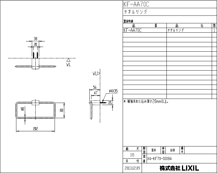 LIXIL,INAX,KF-AA70C,タオルリング,タオルハンガー,樹脂アクセサリーシリーズ(ブラケットメッキ仕上げ,210/φ8×57×96mm)